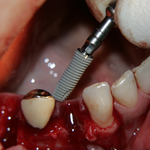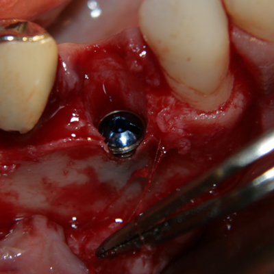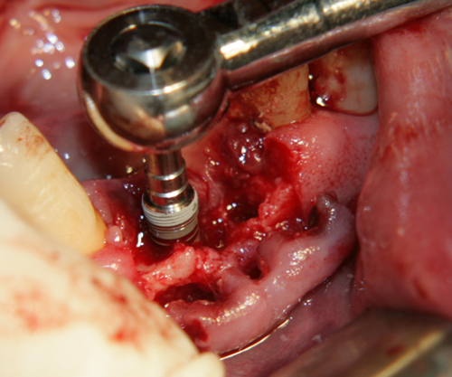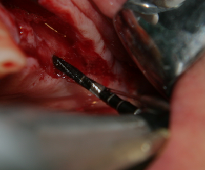 Имплантатът е поставен. За непрофесионалисти снимката е изключително зловеща - кръв, инструменти, зъби и нагледна човешка анатомия... В действителност обаче поставянето на зъбни импланти е една от най-атравматичните операции в областта на Оралната и Лицево - челюстната хирургия: не се отнема никакъв костен обем (както е при екстракцията на един ретиниран мъдрец например), поставя се стерилно тяло в костта, не се отпрепарират тъканите нашироко (както е при операцията на киста, остеомиелит или, недай боже, тумор). Изключително радко се налага антибиотичен прием постоперативно - обикновено при извършване на костна пластика в голям обем. Повече информация за приложението на антибиотиците в имплантологията прочетете тук...